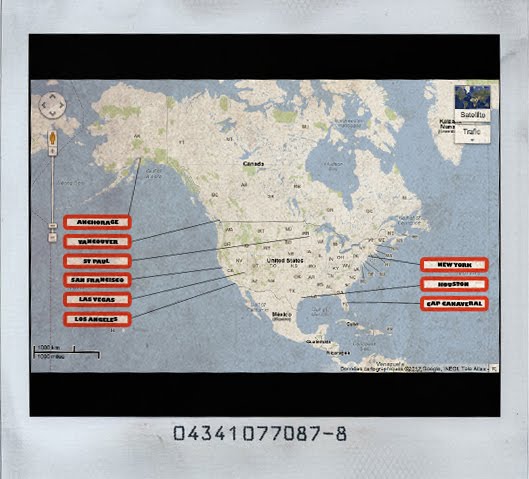 A ce jour la ville de départ n'a toujours pas été trouvé... Récapitulons: Cap Canaveral, Lossse En Gellless, Las Vegas, New York, San Francisco: Brrrr, il fait froid chez vous...