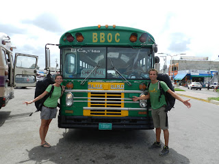 - Taxi, taxi, taxi... Nous découvrons que le terminal est à plusieurs kilomètres de là. - Hey guys, taxi 12$ belize! (soit 6US$) On ne va pas manger tout le bénéf´ de venir en chicken pour prendre un taxi... C´est sous un soleil de plomb que nous partons pour le terminal. Quelques centaines de mètres plus loin, nous rencontrons deux locaux qui nous proposent de nous montrer le chemin, la station de bus étant prêt de chez eux. Eux, parlent espagnol, c´est parfait pour entamer la discussion :-) Au terminal, le chauffeur nous apprend que le prochain bus part dans 30 minutes, tout juste le temps d´aller s´assoir à l´ombre avec les locaux. Nous montons dans notre chicken: 2 blancs au milieu d´une multitude de noirs > on est repéré ;-)On tombe tout de suite sous le charme du Belize: des paysages incroyables, l´ambiance Caraïbes, des maisons multicolores montées sur pilotis, des gens accueillant et une petite touche ¨british¨! Dans le bus Ju s´impose ´aide chauffeur´ à l´arrière du bus: il charge kg de riz, légumes, poussettes etc... un sifflement, on claque la porte et c´est reparti ;-) Voici la magie des chickens bus!
