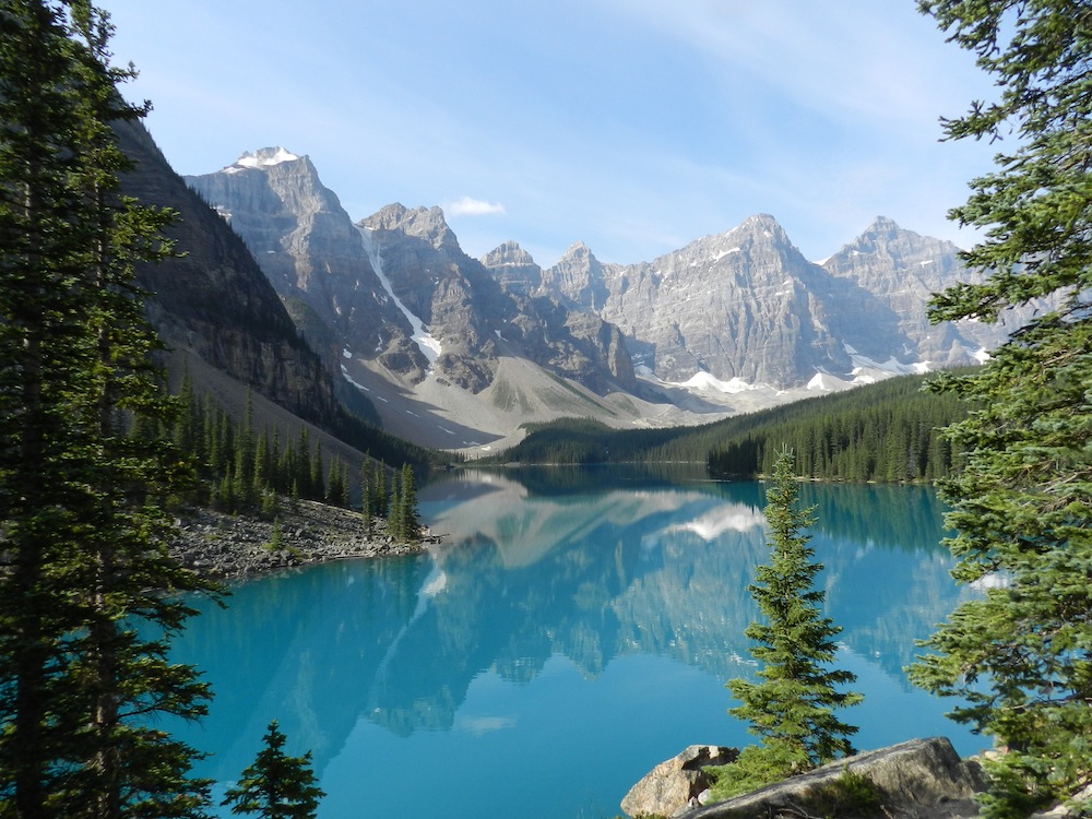 On y passe une bonne après midi et redescendons plus tard au campement. Le soir nous nous glissons dans notre chambre froide... Lors de nos achats "camping" nous avons, volontairement, fait l'impasse sur les matelas... Oui mais le froid arrive directement du sol et le matin il ne nous manque qu'un bâton dans les fesses pour ne pas nous confondre avec des esquimaux ;-). Le lendemain c'est au Moraine Lake, que nous nous rendons, à une 15aine de kilomètres d'ici: nous montons jusqu'à l'embranchement de la route et décidons de tenter notre chance. Quelques minutes plus tard, un charmant couple de québécois nous accueille dans leur camping car jusqu'au lac :-) Nous avons aimé le lake Louise, nous sommes sous le charme du Moraine Lake... Ses eaux ne sont pas bleues glace mais vert émeraude (vert/bleu: on est pas d'accord sur la couleur). Le soleil se lève petit à petit sur les montagnes environnantes: un vrai spectacle! Nous partons faire une petite ballade de quelques kilomètres avec un couple d'Italien, ici, obligation de se promener à 4 minimum > toujours au cas où nous deviendrions "Les hommes qui ont VU l'ours..."
