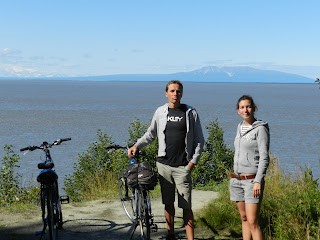 Le lendemain matin, nous découvrons un soleil magnifique en nous levant. Nous partons ragaillardis, louer deux vélos pour faire le coastal trail et découvrir tous les sommets enneigés qui bordent la ville: un vrai spectacle! Nous rentrons par la base d'hydravions (la plus grande d'Amérique du Nord), c'est magique! On les regarde s'envoler tour à tour... puis reprenons notre chemin la tête dans les nuages. Le lendemain nous cherchons une solution pour quitter Anchorage. Ju déniche sur internet une location de voiture pour 5 jours, avec une dépose à Fairbanks pour 300€. Vu le prix des transports en Alaska c'est une véritable aubaine, d'autant plus qu'on pourra économiser les nuits en dormant dans la voiture! Chouette! Une clause retient tout de même notre attention: "Hertz (autant les nommer) peut nous demander notre permis national". N'ayant que nos permis internationaux, je cours à l'agence du centre ville demander des infos, la jeune femme me répond: "Ne vous inquiétez pas, le permis international suffit!", préférant deux avis, j'appelle l'agence de l'aéroport qui me répond la même chose. J'insiste: "Je n'ai que mon permis international avec moi, est-ce suffisant pour vous ou dois-je fournir mon permis national?" -Le permis international est suffisant! Je rejoints Ju et nous prenons la décision de cliquer et prépayons 230€.