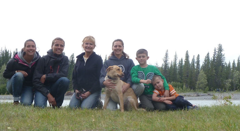 À 17h, nous changeons de rive et partons nous poster en direction de Whitehorse... Après quelques minutes et de beaux sourires, Johnny Caribou s'arrête et nous partageons 500 nouveaux kilomètres avec lui. Cette fois ci c'est moi qui caresse Barbecue :-) Nous voyons deux gros ours qui traversent tour à tour devant nous: Whaou!!! Johnny travaille pour le gouvernement et plus particulièrement pour les mines d'or, une sorte d'inspecteur du travail: on apprend plein de chose, il est super :-) Il nous dépose à 23h au camping. Le marin, nous repartons une fois de plus nous poster à 6 bons kilomètres de là. Un monsieur super sympa nous emmène à un endroit encore plus stratégique... Le temps passe... Nous sommes au milieu de nulle part... Et soudain nous apercevons une voiture qui est passé devant nous depuis une bonne 10aine de minute. Le petit monsieur, qui nous explique ne pas avoir pour habitude de prendre des autostoppeurs, a pitié de nous et décide de tenter l'aventure. Je crois qu'il n'a pas été déçu :-) Nous arrivons maintenant à Haines Junction: un carrefour aménagé avec une pompe à essence et deux magasins au milieu de nulle part dans un cadre tout simplement sublime!!! Notre petit monsieur ne prend pas notre direction, il nous laisse là. Je commence à avoir la boule au ventre car les voitures sont rares... Alors que je prépare notre petit carton, un pickup s'arrête, je cours... Et nous rencontrons notre ange John, qui nous conduira pendant 700 Kilomètres, avec qui nous franchirons notre dernière frontière, qui nous offrira le meilleur burger de notre vie, et qui nous racontera toutes ses histoires... John est un amoureux de l'Alaska, de la nature et chasse les animaux (avec respect). Il nous raconte les fois où il a tué un ours... des caribous... On est tout ouïe :-) Oui, oui, l'anglais revient :-) Un soulagement, j'avais peur qu'on soit resté bloqués sur l'espagnol. John nous mène jusqu'à Glennallen. Là bas, il nous conduit chez son amie Julie afin qu'on lui fasse un petit coucou. Julie et ses deux petits bouts, une famille en or :-)